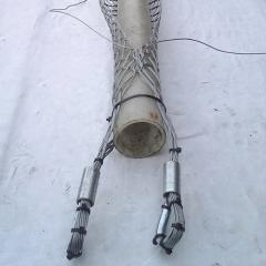 Кабельный чулок стандартный с двумя петлями модели удлиненный предназначен для временного захвата кабеля диаметром 130-150мм с торца при проведении работ по прокладке кабеля в траншеях, колодцах, трубах кабельной канализации. Чулок кабельный имеет две петли с коушем для соединения с тяговым тросом лебедки. Однородное распределение нагрузки по всей площади захвата данного кабельного чулка препятствует повреждению изоляции кабеля и сползанию кабельного чулка в процессе протяжки.